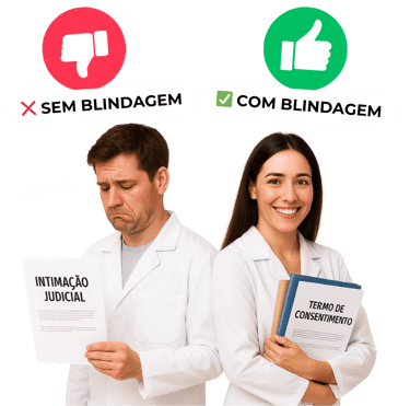 Receba os modelos de consentimento, termos e protocolos usados por clínicas que já enfrentaram processos e venceram. Tudo pronto pra personalizar.